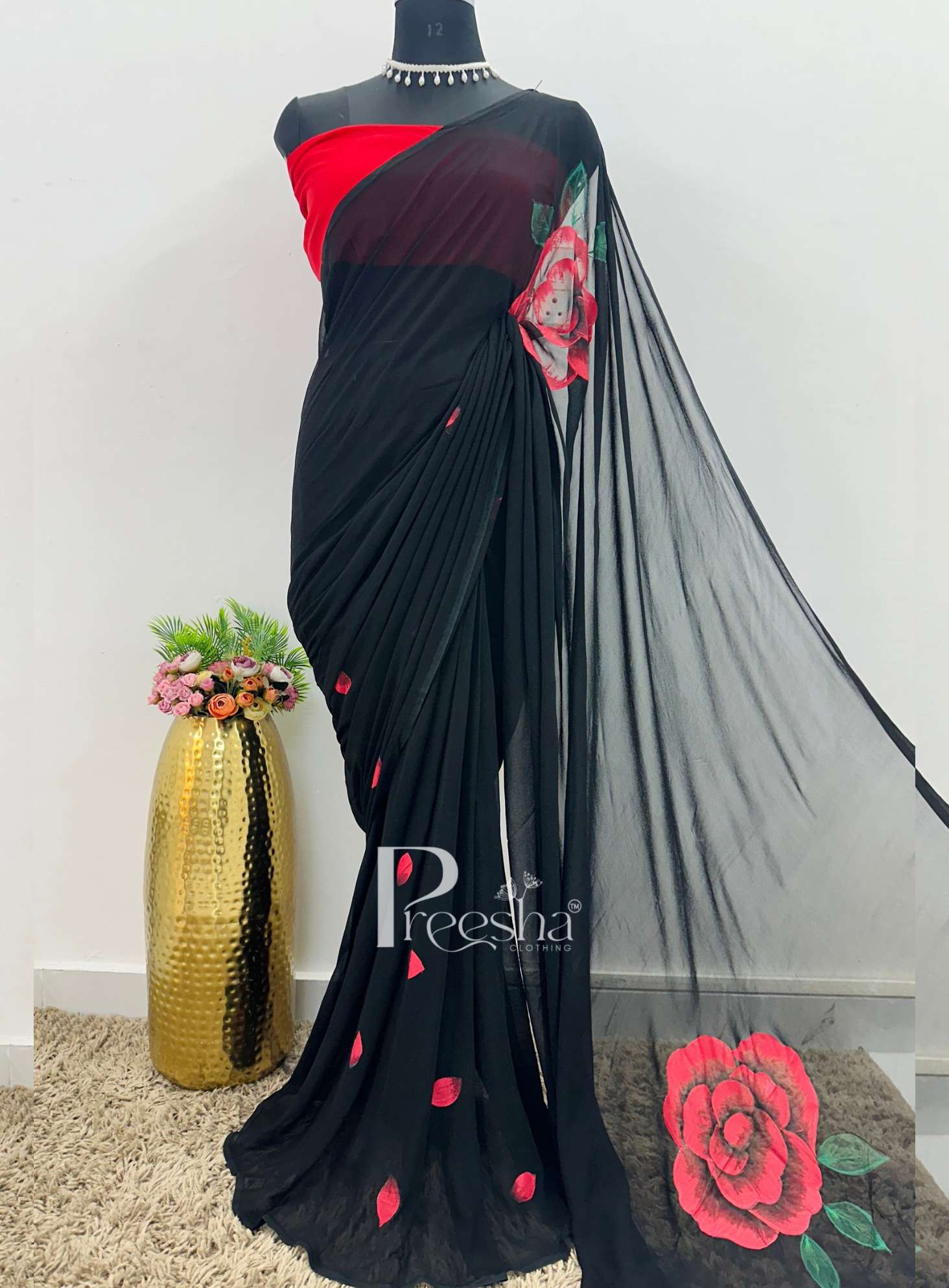 This exquisite saree is a masterpiece of traditional craftsmanship, featuring intricate floral patterns hand-painted on pure viscose georgette fabric. The delicate brushstrokes and vibrant colors bring the design to life, creating a truly unique and breathtakingly beautiful piece.