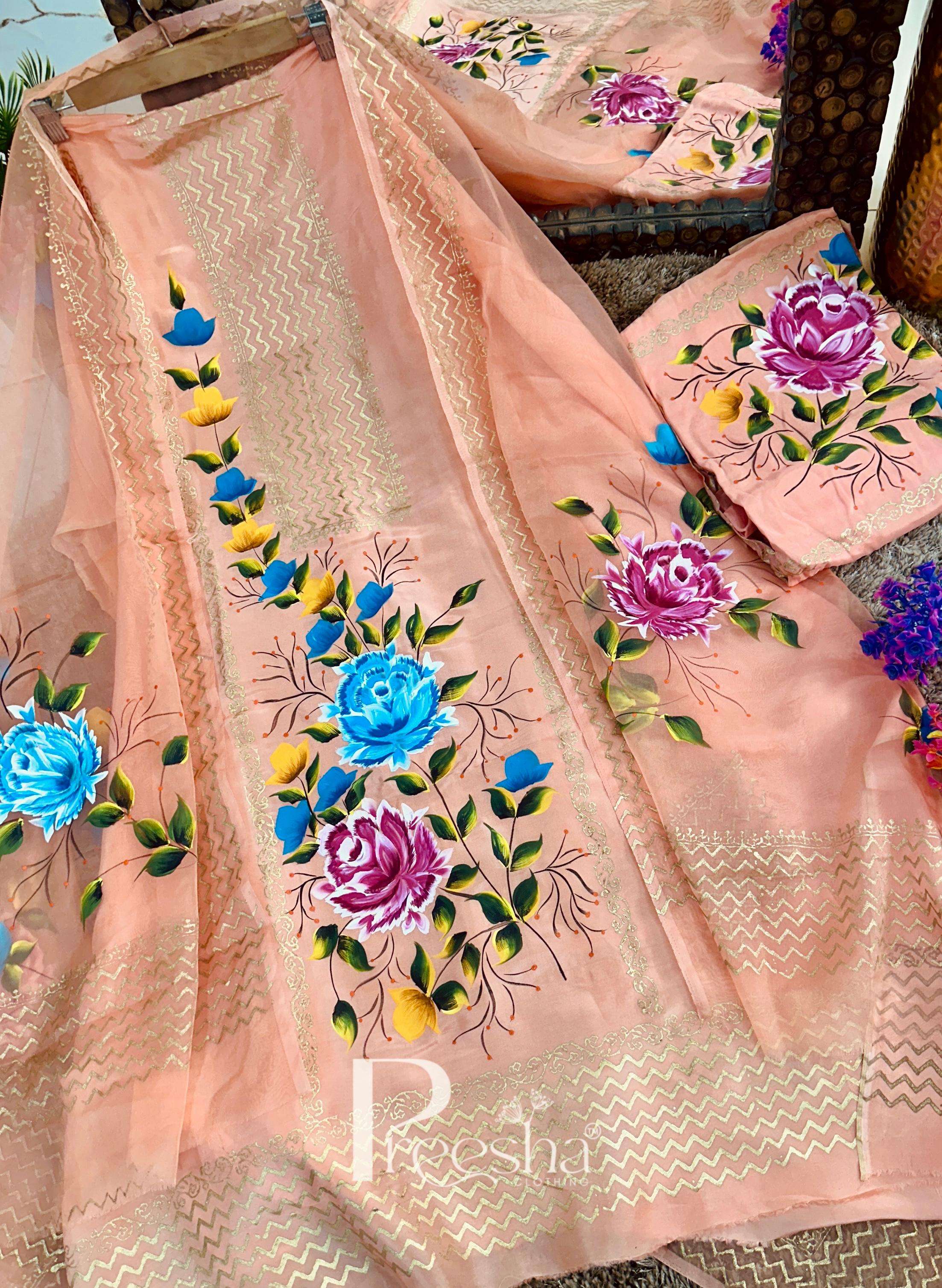 Hand-painted organza dupatta adds a touch of elegance and sophistication