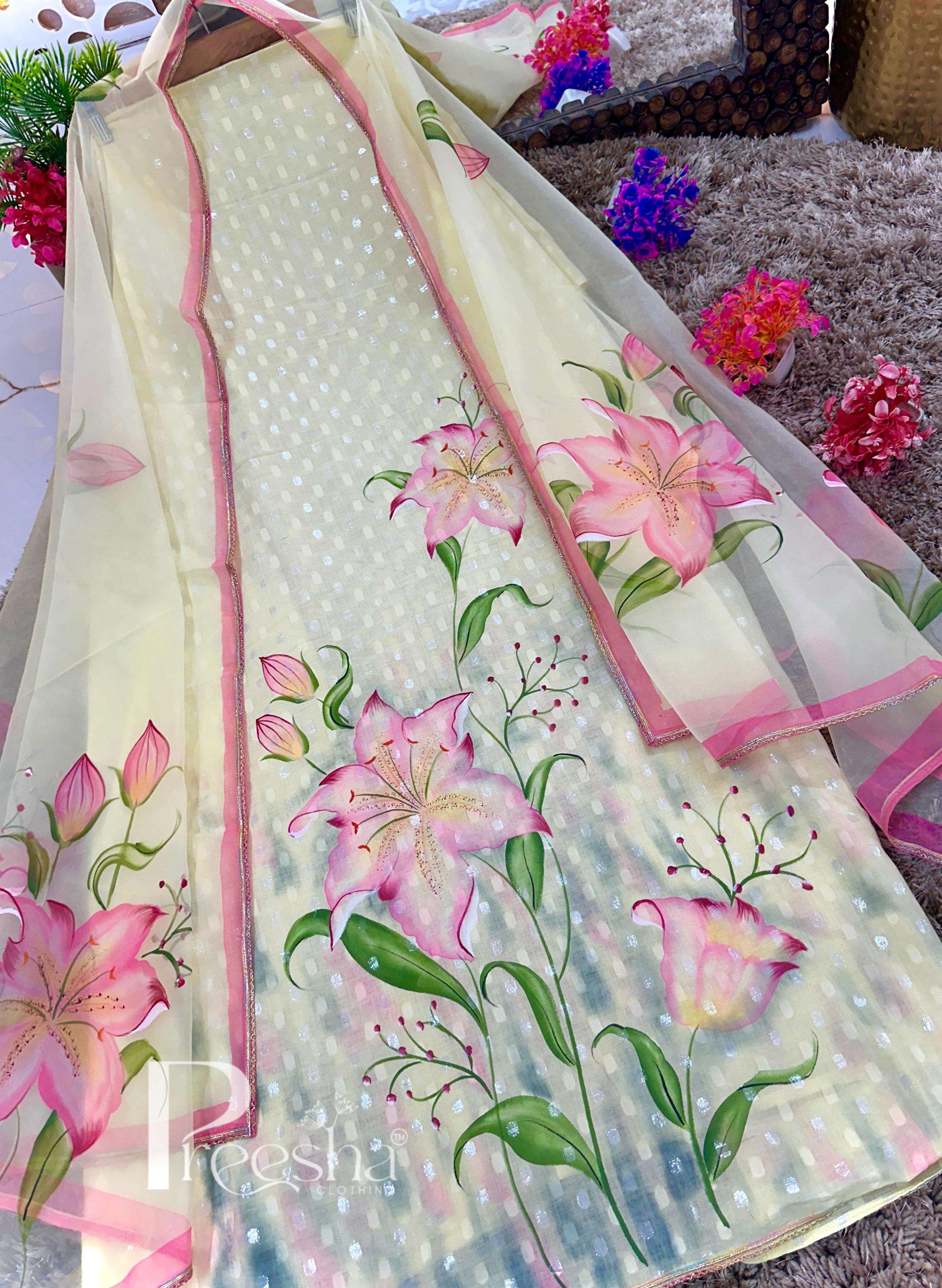Elevate your wardrobe with this exquisite unstitched suit on pure self cotton fabric with delicate brushstrokes and intricate details create a stunning visual floral effect with super stunning soft organza hand painted dupatta and cottom bottom