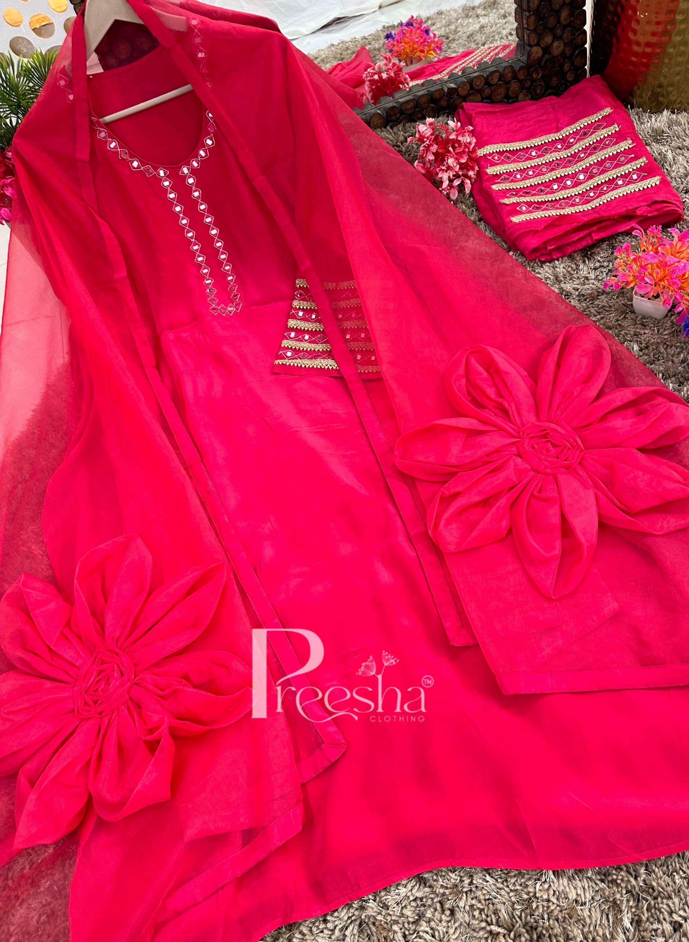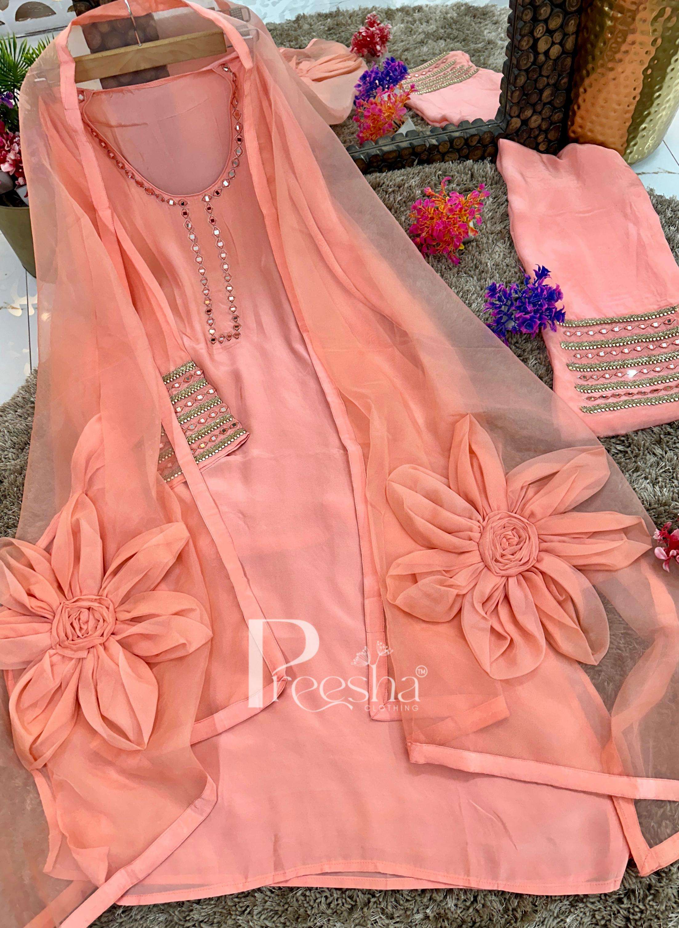 Organza 3D flower dupatta for a unique and eye-catching touch Experience the glamour and sophistication of this beautiful crepe mirrors semi-stitched suit!"