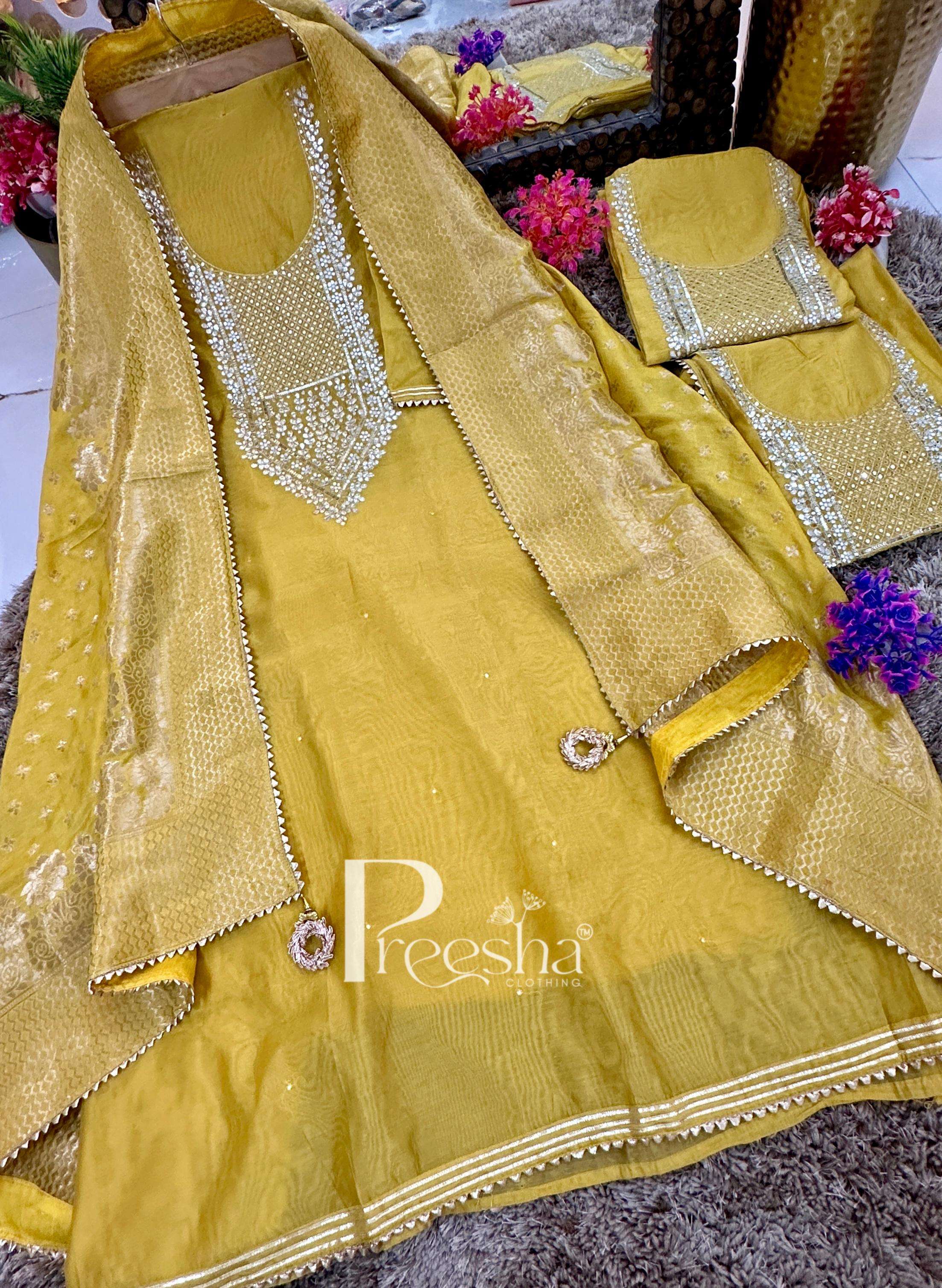 Elevate your style with this majestic pure Chanderi suit, adorned with exquisite handwork. Paired with a luxurious Banarsi dupatta and heavy shanton bottom, this outfit exudes opulence and sophistication.
